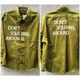 ミリタリーモチーフのツイルシャツにDON'T SQUIRRELL AROUND