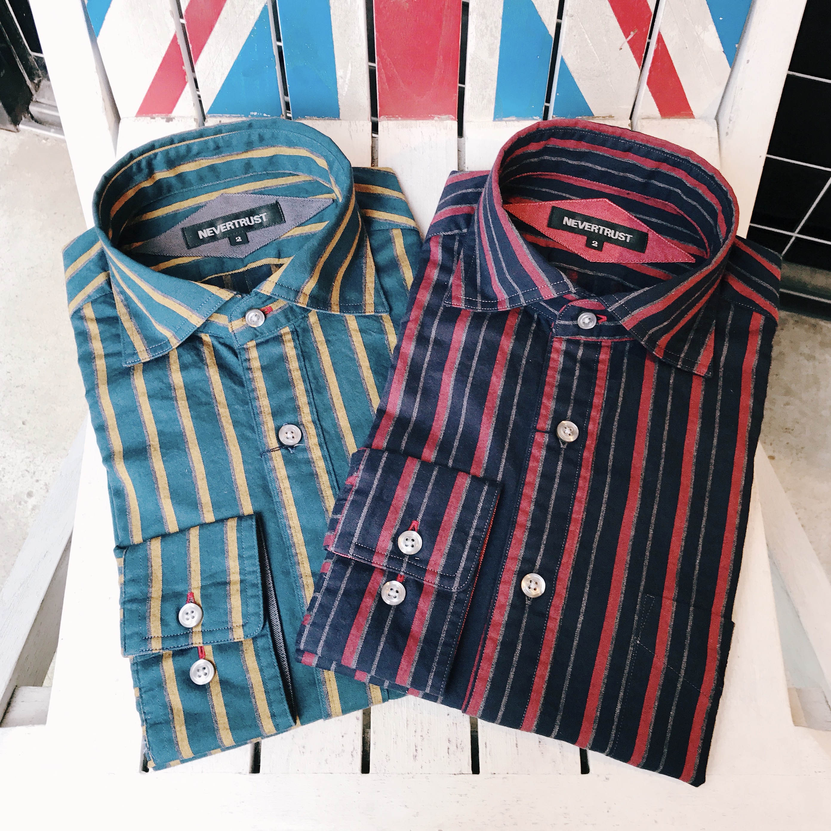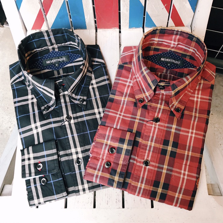 2017/09/05 Category : LIQUID Liquid店:NEVERTRUST長袖シャツ入荷! お待たせ致しました!NEVERTRUST長袖シャツが入荷致しました!実は先週入荷していたのですが、告知する前に、もはや入荷当日からサイズ欠けが沢山出てしまいまして…。ですがばっちり再発注をかけ、週末にはまた揃います!今度こそ前告知(^^;)ということで今回入荷したシャツ達をご紹介します!まずは好評のノンアイロンシリーズ。新色でバーガンディが登場!襟高でルード!結婚式などのイベントはもちろん、ビジネスにも使われる方も多いです!新型としてはラウンドカラーが登場!こちらも、デイリー使いからイベントなどまで幅広くどうぞ♪そして柄物はホリンゾンタルカラーシャツがアツいです。特にグリーンがかなりキラー!薄い起毛で生地感もヴィンテージチック。こちらはメーカー完売、週末当店入荷分で終了です!!そして秋冬らしいダークトーンチェックのボタンダウン。襟高、タイトシルエットでスタイリッシュ。第1ボタンを開けた際の襟のS字ロールも美しい!NEVERTRUSTのシャツは”ディテールにこだわる”お客様に大好評、その美しい襟とシルエット、60'sの香りは文句なし!!ですが、無くなるのも早いです(^^;)気になる方は是非お早めにチェックお願い致します!長袖シャツで過ごせる今日この頃…。1枚でキマってしまう勝負シャツ探しに来てください♪それでは、モエベイビーでした(*^▽^*)