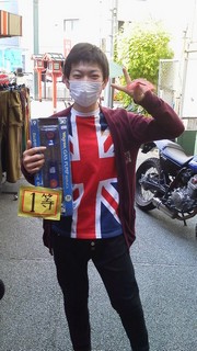 2012/05/14 Category : BLOG やったぜ!コウタロウ!1等GET! 大好評のくじ引き大会 ついに、追加した1等が出ました!!! ジャン! 1等をゲットした、ハイスクールスチューデント、コウタロウ君です!!!髭をそっている最中に間違って肌を切ってしまうというアクシデントで、流血。そんな訳で、今日はマスク姿で来店てくれました(笑) ゴールデンウィークから沢山のお客様にくじを引いていただき、 3000円刻みで何度もお買い上げ頂くという裏ワザを沢山のお客様に使われ(笑) 予想を上回る、盛り上がりをみせたくじ引き大会。 追加で設けた1等が遂に出ました! と、いうことで誠に勝手ではありますが、この辺で終了させていただきます! 参加していただいた皆様、ありがとうございました!!!! PR