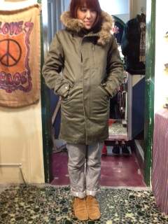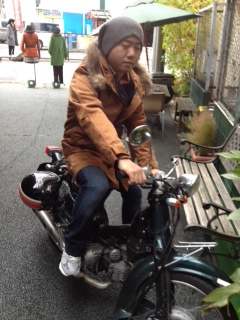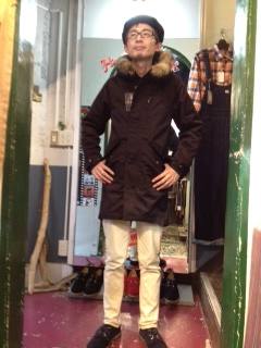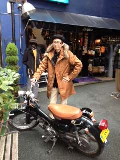 2012/12/01 Category : BABACOOL ババクール新入荷 クールスキャットモッズパーカー着用編 クールスキャットのモッズパーカー、機能編に続いて、着用編。 防寒の性能ももちろん最上級だけど、やはりファッションなんで、カッコよさも大事。 実は、このモッズパーカー、シルエットも素晴らしい。 そこは、やはりUKモッズ系ブランドの矜持として、スマートで綺麗なパターンにはこだわってますよ! まずは、 Sサイズのブラックを着てみました ブラックをタイトに着ると、かなりロックっぽいですね。 中にあまり着込まないロック好きの嗜好のかたは、ちょっと不健全!?なこういうサイズ選びをするのでは? お次は、M51やM65の、あの野暮ったさがリアルで好きって方や、ヘビーゾーン生活ゆえ、重ね着が必要な方は このLサイズを。 ちょうどよさげなバイクが停まってますな。 この色、カブに似合うな~。シートとコーディネート、なんてね。 あ、持ち主がやってきました。 似合いますな~。 袖口のリブと、首を取り囲むフードは、ライダーを寒さから守ってくれます。 そして、 Sサイズは、女の子にもおススメです。 小柄!?なノッチが着ても、ホラ、こんなにスッキリシルエット。 厚手のライナーのボリュームをふまえてこれだけ綺麗なシルエットをだすのは難しい。 こだわりぬいて何回もサンプルを作り直したか、あるいは奇跡のまぐれか、どっちかですね。 使い道やスタイル、背格好によって、サイズ、カラーを選べるのも楽しいですね。 でも、やはりこれは体感して頂きたい。ぜひ試着してください!