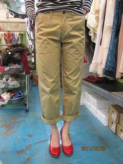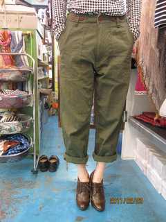 ハリのあるしっかりとしたチノクロスを使っています。ちょっとゆるめなサイズ感なのに、とてもスッキリとしたきれいなシルエット。穿き心地もすごくいいんですよー!