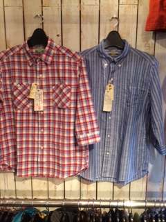 2014/03/17 Category : HONKEYTONK 春の準備は、増税だろうがなんだろうが、シャツから!ホンキートンク店。 ようやく、アウターに隠れていたシャツが表舞台になる季節がやってきました。 ホンキートンク店にもたくさんのシャツが入荷しております。 まずは、ストライプのワークシャツ。 生地は、ガッチリとしたワークな生地。 ですが、 襟がボタンダウンシャツになっているので、サービスマンシャツ風。 タイをしても良い。ワークトラウザーに良く似合います。 スタジオダルチザン ワークボタンダウンシャツ ¥14、800+税 続いて、バズリクソンズから。 もちろんミリタリー、整備士系デザインのワッペンをあしらったワークシャツ。 毎年よく売れてます。 こちらは背中にもカッコいいワッペンや刺繍が施されてますが、まあ、見てのお楽しみ。 バイク乗りの方に良く似合います。 ¥14、800+税 続いて、シュガーケーンから、チェックのボタンダウンシャツ。 これは、生地感といい、色合いといい、ボタンダウンといっても、東部のエリートのアイビーリーガーというよりは、西海岸の自由奔放な雰囲気。 着こなしも、シワシワのコットンパンツか、勢い余って早々ショーツなんかがいい。 デニムなら、色落ちしまくってるやつが似合います。 ¥8、900+税 お次は、柔らかい生地のシェックシャツ。 ポケットの仕様は、両ポケのワークシャツタイプ。 ベージュのチノが好相性。 前を開けて、白地のプリントTに羽織るのもいい。 こちらはもうサイズ欠けが出ております。 ¥8、900+税 最後は、 まだ早い? 7分袖のシャツ。 赤のチェックはワークシャツタイプ、右のストライプはボタンダウン。 7分袖のシャツは、ここ数年に出来たものじゃなくて、結構古くから有ったみたいですね。 というのも、昔僕が古着屋で、柄のカッコいいデッドストックのパッケージ入りのシャツを買って、開けてみたら、まさかの7分袖だった、ってことが有ったもので(笑) 多分60年代のモノだったと思います。 決して流行りものではないのですね。 ¥9、800+税 どちらも色違いあり。 他にも、魅力的なシャツがたくさん揃っております。 春のオシャレはシャツから。 ボタンの開け閉めがめんどくさい、なんて、言っちゃダメだぜ! 他店舗含め、是非チェックしてみて下さい♪