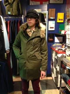 2013/12/18 Category : BABACOOL BA: COOL SCATより、待望のモッズパーカーが入荷!! お待たせしました!! COOLSCATよりアルティメット防寒!!なモッズパーカーが入荷です♪ 去年も大人気だったこちら、要チェックです! モッズパーカー/¥18,690 色はブラック、キャメル、オリーブの3色。 ブラック、オリーブはサイズS、M、L キャメルはLのみの入荷です。 去年も散々紹介しましたが、再度魅力を紹介♪ 袖口までフェイクファーのボアライナー付き。袖口はリブになっており、風を通しません! ポケット内側にも同素材のボアが貼っていて、手袋いらず! ライナーとフードのファーは取り外し可能なので、真冬は付けて、春先と秋口は外して、ロングシーズン使用出来ます!! 1(S)サイズ着用。 Sサイズはかなりストイックなタイトサイズ。 シャツ等の薄いトップスに合わせるのが必須かもしれません。 モッズパーカーでこのシルエットはかなり珍しいと思うので、アウターも細身がいい!という方にはオススメ! もともと細身の方や女性にもオススメのサイズです。 2(M)サイズ着用。 こちらはよりコート感のあるシルエットで、中に着込みたい方にオススメ。 大きいとはいえ、見た目はスッキリシルエット♪ ガタイのいい方はさらに大きい3(L)サイズをドウゾ! さらに! 前たてを全部締めればマフラーいらずの完全防寒! 体感ですが、ファーのボリュームが前年よりも上がっているような感じ。 寒さに加え、風がある時はこれくらいあると嬉しい! 前年は好評すぎて年末には売り切れ、買えない方も出てしまったほど。 これ一枚で冬は怖いもの無しですよ! 今年も競争率が高そうなので、早めのチェックを!!